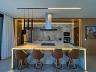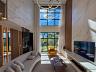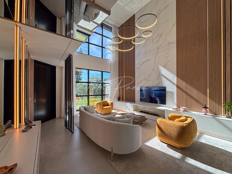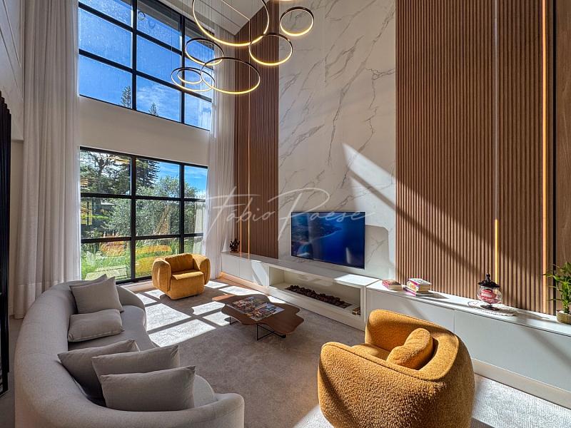 O pé-direito duplo na sala de estar valoriza a iluminação natural e amplia a sensação de espaço, criando ambientes elegantes, arejados e acolhedores.